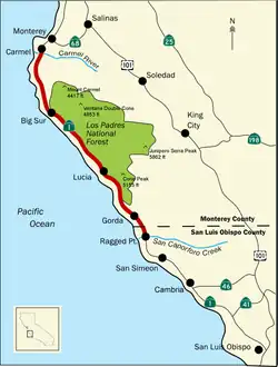 San Carpóforo Creek flows through San Carpóforo Canyon and into the Pacific Ocean in a small bay 20 miles (32 km) north of San Simeon on the Central Coast of California. The creek is generally considered to be the southern border of the Big Sur region of Central California.[1]