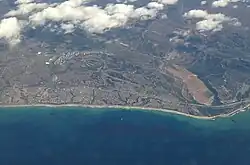 San Clemente (/ˌsæn kləˈmɛnti/ san kleh-MEN-tee; Spanish for 'St. Clement'[6] Spanish: [saŋ kleˈmente][7]) is a coastal city in southern Orange County, California, United States. It was named in 1925 after the Spanish colonial island (which was named after a Pope from the first century).[8] Located in the Orange Coast region of the South Coast of California, San Clemente's population was 64,293 in the 2020 census.[5] Situated roughly midway between Los Angeles and San Diego, San Clemente is a popular tourist destination in Southern California, known for its beaches, Spanish Colonial Revival architecture, and hospitality industry. San Clemente's city slogan is "Spanish Village by the Sea."[9]