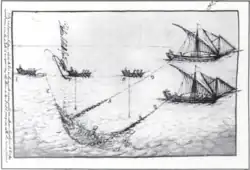 The main salvage crew dispatched from Vera Cruz to try to recover the treasure was under García de Escalante Alvarado (a nephew of Pedro de Alvarado). Alvarado bought six vessels to recover the Emperor Charles V's coin and bullion, and the other cargo.[4] There were 102 sailors, including eleven Spanish divers.[13] The masts of San Esteban could still be seen.[11] Salvage of San Esteban began at once. She had sunk in just 12 to 18 feet (3.7 to 5.5 m) of water, so could be thoroughly explored.[13] The salvage team dragged a chain along the bottom to find the two other ships.[11] Santa Maria de Yciar was located on 20 August. Her hull had split and the cargo was scattered around the wreck.[13]