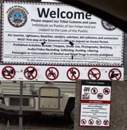 As a sovereign tribal nation, San Felipe Pueblo exercises strict restrictions for non-tribal visitors, and features numerous rules and regulations on visitor activity. Access is prohibited for any reason without a permit. Any audio or visual documentation, including sketching, is prohibited without a permit. While the Pueblo permits visitor access during public events, photography of these events is strictly prohibited; the tribal government claims the right to confiscate equipment upon suspicion that it has been used to violate regulations.[3][4]