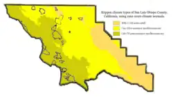San Luis Obispo County has three main climate types. BSk climate can mainly be found in the eastern portions of the county, along with certain smaller areas in the north. Csa climate can mainly be found in the central portions of the county, in communities such as Paso Robles. The rest of the county is made up of the Csb climate type. The Csb warm-summer mediterranean type climate together with the county's varied landscapes reminds visitors of European locales.[12]