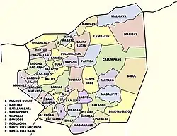 San Miguel is politically subdivided into 49 barangays, as shown in the matrix below.[16] Each barangay consists of puroks and some have sitios