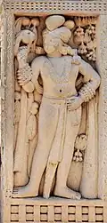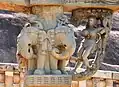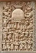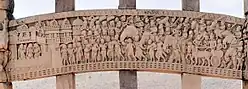 Although made of stone, the torana gateways were carved and constructed in the manner of wood and the gateways were covered with narrative sculptures. It has also been suggested that the stone reliefs were made by ivory carvers from nearby Vidisha, and an inscription on the Southern Gateway of the Great Stupa ("The Worship of the Bodhisattva's hair") was dedicated by the Guild of Ivory Carvers of Vidisha.[41][42]