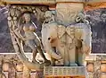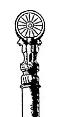 The Sarnath capital is a pillar capital discovered in the archaeological excavations at the ancient Buddhist site of Sarnath.[52] The pillar displays Ionic volutes and palmettes.[53][54] It has been variously dated from the 3rd century BCE during the Mauryan Empire period,[55][52] to the 1st century BCE, during the Sunga Empire period.[53] One of the faces shows a galopping horse carrying a rider, while the other face shows an elephant and its mahaut.[53]