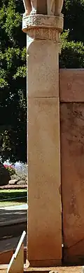 The height of the pillar, including the capital, is 15 ft, its diameter at the base 1 ft. 4 in. Up to a height of 4 ft. 6 in. the shaft is octagonal; above that, sixteen-sided. In the octagonal portion all the facets are flat, but in the upper section the alternate facets are fluted, the eight other sides being produced by a concave chamfering of the arrises of the octagon. This method of finishing off the arris at the point of transition between the two sections are features characteristic of the second and first centuries BCE. The west side of the shaft is split off, but the tenon at the top, to which the capital was mortised, is still preserved. The capital is of the usual bell-shaped Persepolitan type, with lotus leaves falling over the shoulder of the bell. Above this is a circular cable necking, then a second circular necking relieved by a bead and lozenge pattern, and, finally, a deep square abacus adorned with a railing in relief. The crowning feature, probably a lion, has disappeared.[36]