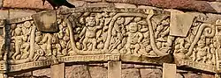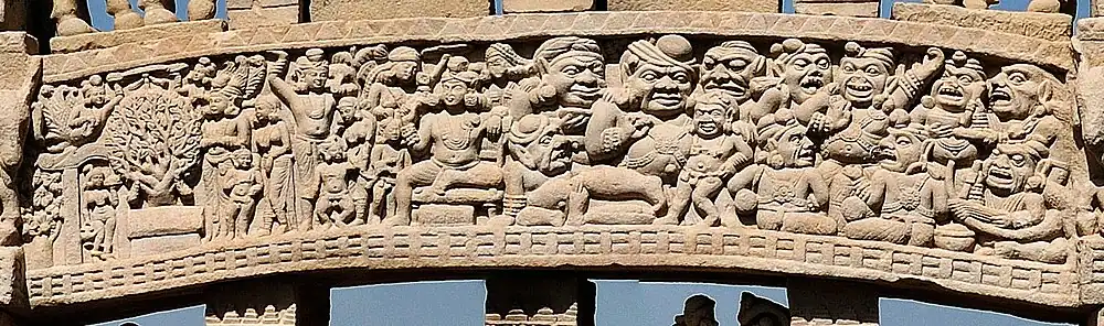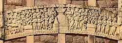 ![]() Stupa No. 2 Shunga period, but mason's marks in Kharoshti point to craftsmen from the north-west (region of Gandhara) for the earliest reliefs (circa 115 BCE).[27][28][23] |