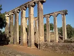 Later, the platform was enlarged to 41.76×27.74 metres and re-used to erect a pillared hall with fifty columns (5×10) of which stumps remain. Some of these pillars have inscriptions of the 2nd century BCE. In the 7th or 8th century a small shrine was established in one corner of the platform, re-using some of the pillars and putting them in their present position.[20][19]