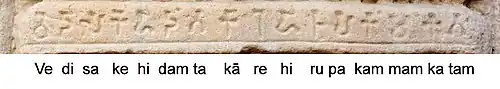 The inscription reads: "Vedisakehi damtakārehi rupakammam katam" meaning "The ivory-workers from Vidisha have done the carving".[44][45]