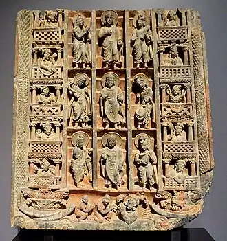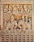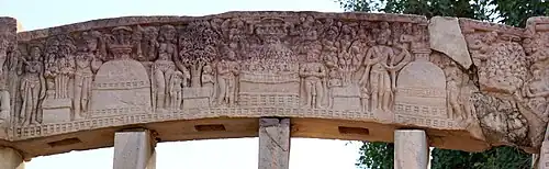 ![]() Stupa No. 2 Shunga period, but mason's marks in Kharoshti point to craftsmen from the north-west (region of Gandhara) for the earliest reliefs (circa 115 BCE).[27][28][23] |
