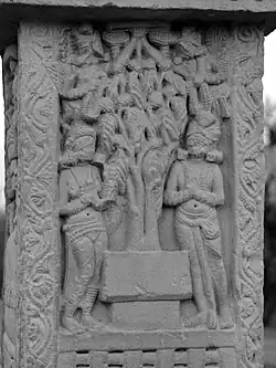 Although made of stone, the torana gateways were carved and constructed in the manner of wood and the gateways were covered with narrative sculptures. It has also been suggested that the stone reliefs were made by ivory carvers from nearby Vidisha, and an inscription on the Southern Gateway of the Great Stupa ("The Worship of the Bodhisattva's hair") was dedicated by the Guild of Ivory Carvers of Vidisha.[41][42]