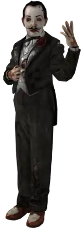 Sander Cohen is presented as an unhinged Jewish American creative professional.[1] Cohen's character traits and name were influenced by American entertainer George M. Cohan, who was a notable playwright, composer, lyricist, actor, singer and dancer. However, BioShock creator Ken Levine deliberately wrote Cohen to be an untalented songwriter.[2] His physical appearance, specifically his pencil moustache, evokes surrealist artist Salvador Dalí.[3] Cohen's pancaked make-up was inspired by a scene with Bette Davis' character Baby Jane Hudson in the film "What Ever Happened to Baby Jane?"[4]