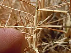It spreads by forming lateral underground stems and so forms clumps or tussocks. These are useful in binding dry, loose soil and so it may be propagated to stabilise slopes or control erosion. It has little agricultural use but may be eaten by foraging animals. It has been used by the Hopi of Arizona to make brushes.[1]