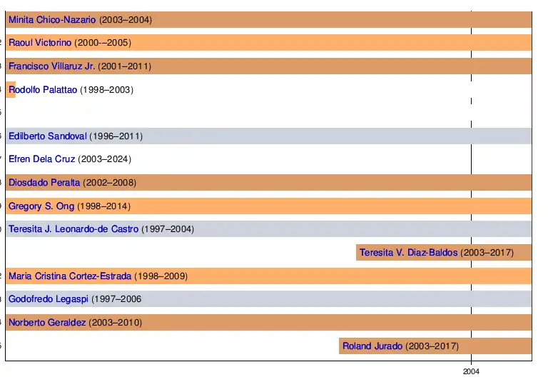 - ^ Assoc. Justice Ong became acting PJ after the retirement of PJ Sandoval and PJ Villaruz's appointment and again between the retirement of PJ Villaruz and the Appointment of PJ Cabotaje-Tang