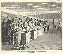 By 1880, Sandusky had risen to a population of 16,000. There were then 20 churches and three newspapers in the community. The city boasted 29 businesses with at least 10 employees. Products being produced included lime, railroad locomotives and cars, carriages, wheels, crayons, chalk, beer, paper, baskets, and tools.[18] By 1886 Sandusky was the center of wood wheel manufacture in the United States. It was also the location of the Ohio State Fish hatchery and the Ohio Soldiers and Sailor's Home.[18]