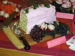 White bread is usually used to create a sandwich loaf, but whole wheat is also used. Sometimes white and whole wheat are used in alternating layers to create a ribbon effect. Common garnishes are olives, parsley, grapes, and carrot curls. The loaf is sliced like a cake and eaten with a fork.