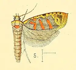 The wingspan is about 10 mm. The costal and apical portions of the forewings are orange, the extreme costal margin dotted irregularly throughout with leaden grey. There is a large reniform leaden grey spot before the apex, not reaching the costa, but attenuated downwards to the apical margin above the anal angle, as well as a large leaden grey patch extending from the base nearly to the anal angle, occupying three-fourths of the width of the wing, and approaching the costa at its upper and outer angle at two-thirds from the base, its upper and outer edges irregularly sinuous and clearly defined, the outer edge somewhat transverse and oblique. This leaden patch contains three transverse bright vermilion bars, not reaching to its upper edge, and a spot of the same colour. The first bar near the base touching the dorsal margin is angulated outwards on the fold, the second bar tends a little obliquely inwards from the middle of the dorsal margin and is attenuated at a point a little above the fold. The third bar starts erect from the dorsal margin and is dilated and bent a little inwards at half its length. Between the first and second bar, and almost touching the orange costal border, lies a nearly circular spot containing a few black scales before its upper edge, which is narrowly margined with orange. The hindwings are brownish fuscous.[3]