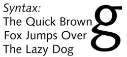 Humanist designs vary more than gothic or geometric designs.[28] Some humanist designs have stroke modulation (strokes that clearly vary in width along their line) or alternating thick and thin strokes. These include most popularly Hermann Zapf's Optima (1958), a typeface expressly designed to be suitable for both display and body text.[29] Some humanist designs may be more geometric, as in Gill Sans and Johnston (especially their capitals), which like Roman capitals are often based on perfect squares, half-squares and circles, with considerable variation in width. These somewhat architectural designs may feel too stiff for body text.[26] Others such as Syntax, Goudy Sans and Sassoon Sans more resemble handwriting, serif typefaces or calligraphy.