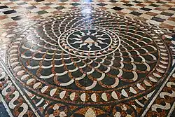 The floor is still the original one, supposedly made by Pietro da Porlezza in 1462. It is made of marble in three colors: white Istrian, black basanite, recalling the robes of the Dominicans,[47] and red, recalling that the church is dedicated to St. Peter the Martyr of Verona.[31] The most elaborate parts are found in the nave and the transept, and in the center of the latter there is a rose window with the black and white rayed shield, the symbol of the Order. Neither the ancient chapels nor the sacristy show any traces of the ancient floor.[32] Also traditionally attributed to da Porlezza is the red Veronese marble stoup located near the side entrance.[31]