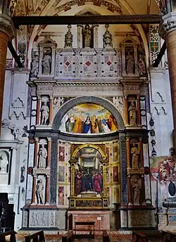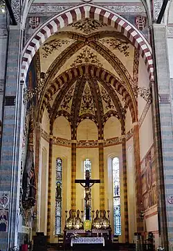 The presbytery is raised a few steps above the rest of the basilica and occupies the entire area of the high apse, preceded by a square bay covered by a cross vault; on the right wall is the Last Judgement, attributed to Turone di Maxio,[61] while on the left wall is the monument to Cortesia Serego, a condottiere in the time of the Scaligeri.[62] The high altar, dedicated to St. Peter the Martyr, is made of light yellow marble and was built and consecrated in 1952; previously it was made of a red stone that was later placed at the base of the modern altar. In the center of the altar is a simple marble tabernacle, placed on March 22, 1529, at the behest of Alessandro dal Monte, who paid for it;[63] above it is a large painted wooden crucifix.