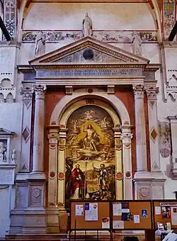 The main lunette has a representation of the Holy Trinity with the figures of St. Joseph and the Virgin Mary on either side. The Father is seated on a Gothic style throne with the crucifix between his knees and Christ at his side with a dove on his head. The figure is completed by a pair of angels above the Trinity. In the two smaller lunettes, the Bishop leads the people of Verona with the city's banner, and in the other, St. Peter the Martyr leads the friars with the black and white banner of the Dominicans.[31] These frescoes seem to be largely lost today, despite a not very successful retouching during the restoration of 1881;[32] the art historian Adolfo Venturi has recognized in these paintings the influence of the school of Stefano da Zevio, attributing them to some of his pupils.[33][34]