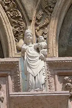 The smaller arches rest on the architrave of the portal, which is decorated in bas-relief with six representations in chronological order of the life of Christ: the Annunciation, the Nativity, the Adoration of the Magi, the Way to Calvary, the Crucifixion and the Resurrection.[33] On either side of the architrave are two statues, the left one of St. Anastasia and the right one of St. Catherine of the Wheel. In the center of the architrave, above the elegant column that divides the two doors and rests on a shelf, there is a statue, larger than those on either side, depicting the Virgin and Child of the Venetian school. The dividing column has three high reliefs on the front and two sides. Opposite is St. Dominic, with the star under his feet; on the left, St. Peter the Martyr, preaching to the crowd,[35] with the sun below; and on the right, St. Thomas, towering above the moon, holding the Book of the Doctors of the Church, while instructing a young monk.[31][33]