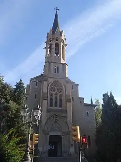 On the exterior façade there is a pointed window instead of the typical rose window with a stained glass window that represents the Virgin of Montserrat. The mid-rise octagonal bell tower is topped by a conical black tile pinnacle reminiscent of Northern Europe. At the same time, we find some details of Catalan Modernism of the time, such as the ornamentation that surrounds the upper part of the bell tower based on pointed battlements and Greek crosses. A notable feature of the entire exterior is its verticality that gives it a "transcendent" air.