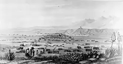 In addition to remaining the administrative and political heart of Nuevo Mexico, Santa Fe maintained its status as the central trading and transportation hub west of the Mississippi. Beginning in the 1820s, the Santa Fe Trail brought lucrative commercial links to what was then the American frontier in Missouri, attracting both indigenous and Euro-American traders.[26] The opening of trade and migration with the U.S. also facilitated friendly relations between the new Mexican republic and its American counterpart, for which Santa Fe was the primary nexus.[26]