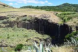 Its volcanic origin is characterized by a substratum of basalt deformed by a series of fractures that run along a northwest to southeast orientation (interlaced with lode and deposits of mafic silicate material), resulting in the following volcano-stratigraphic layers:[25]