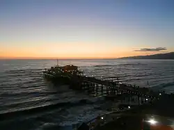A sketch of Santa Monica and the pier, 1875An early Santa Monica Pier, 1877The pier with Pacific Park on the left, 2006Anglers on the Santa Monica Pier, 2009Santa Monica Pier at dusk, 2010View of the pier and Pacific Park from the beach at night, 2012The Ferris wheel and roller coaster lights at night, 2009View of the Municipal Pier from the Ferris wheel, 2013In 2018