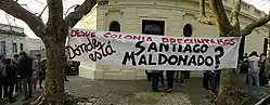 On September 1, 2017, a month after Santiago Maldonado's disappearance, thousands of people expressed themselves through rallies and demonstrations asking for his appearance alive. The largest demonstration took place in Plaza de Mayo and was organized by Grandmothers of the Plaza de Mayo, Mothers of the Plaza de Mayo (Línea Fundadora), Relatives of the Disappeared and Imprisoned for Political Reasons, HIJOS, the Center for Legal and Social Studies (CELS), the Argentine League for the Rights of Man, and the Permanent Assembly for Human Rights, among other organizations.[68] In other cities, such as Mendoza, Mar del Plata, San Luis, San Juan, Neuquén, Salta, Posadas, Jujuy, Santiago del Estero, Villaguay, Concepción del Uruguay, Gualeguaychú and Concordia there were rallies and demonstrations with the same demand.[69] In Rosario and Córdoba there were rallies with an attendance of 40000 each.[70][71] There were also protests in Spain, Brazil, France, Uruguay, Chile, Mexico, Austria and the United States which were organized through social media.[72][73] In London,[74] São Paulo and Madrid, groups of people expressed their solidarity with the demand for the appearance of Santiago Maldonado alive.[75][76][77]
