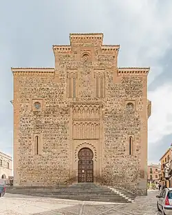 The church was constructed in Mudéjar style with influences from the Romanesque style of Castile. The freestanding bell-tower incorporated the remains of the former mosque's minaret.[1]