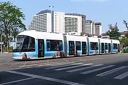 The tram operates without overhead wires. Instead, the trams are charged by contacts above each stop.[3]