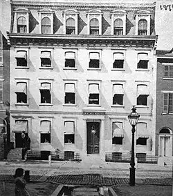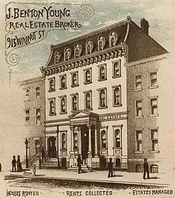 When she was seventeen years old, reverses left her family poor and she was made partly helpless by paralysis. Obliged to support herself and other members of her family she took the Irving House, a hotel of ninety-five rooms, in Philadelphia, and by good management made it a successful establishment and lifted herself and those dependent upon her above poverty.[2] The building, at 915 and 917 Walnut Street, was originally two venues, Franklin Savings Fund and the Cyrus Cadwallader, Treasurer for the Fund. When the Franklin Savings Fund failed in the 1880s, the building became The J. Benton Young, Real Estate Broker, in 1885. Soon after it was converted in the Irving House: a night's stay at the hotel was between US$2 to US$2.50 in 1898 (US$2 in 1898, US$56.34 in 2017). In 1942, Irving House was replaced by the Hotel Senator. The building was later demolished.[3]