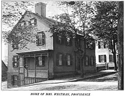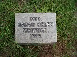 Sarah Helen Whitman died at the age of 75 on June 27, 1878[19] at the home of a friend at 133 Brown St [20] (then 97 Bowen St.) in Providence, Rhode Island,[21] and is buried in the North Burial Ground.[13] In her will, she used the bulk of her estate to publish a volume of her own poetry and that of her sister. She also left money to the Providence Association for the Benefit of Colored Children and the Rhode Island Society for the Prevention of Cruelty to Animals.[22]