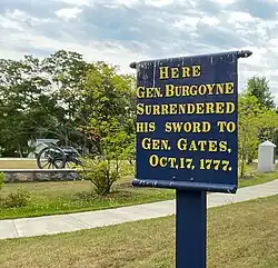 In 2021, management of the site where the British Army surrendered was transferred to the National Park Service.[4][5] The Saratoga Surrender Site Memorial Park marks the precise location where British General John Burgoyne surrendered his army to General Horatio Gates on October 17, 1777.[4] The 19-acre park is located nine miles north of the Saratoga Battlefield Park, and a half mile south of Schuylerville on U.S. Route 4.[4] The park includes explanatory plaques and signage, and two cannon.