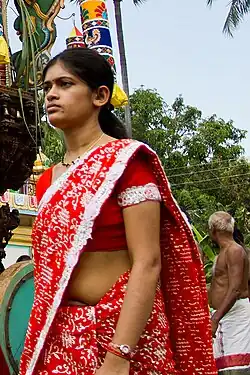The sari is common female attire in the Indian subcontinent. It is a piece of long (generally 5.5 metres or 18 feet) cloth which can be made of various materials: cotton, silk, nylon, chiffon or synthetic fabric. It is worn over an inner skirt (petticoat) which is tightened around the waist by a thick cotton cord. This is the traditional costume of most Indian women. The sari is attached to the waist throughout the day in the hot and humid climate. The waist is often soiled with dust and sweat and remains without proper cleaning. This causes changes in pigmentation and mild scaling over the waist. This, in turn, causes chronic irritation and gradually malignancy may develop in the skin at the waistline.[2]