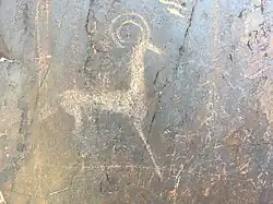 The area was settled by hunters and fishermen from the Kelteminar culture in the Neolithic period.[3] The availability of water and good hunting made Sarmishay a good place to settle,[2] and archaeologists have also found evidence of religious rites being performed. The earliest petroglyphs date from this time, though the majority are from the Bronze Age.[5] Scythian tribes moved into Sarmishsay in the Iron Age and occupied the area from the 9th to 2nd centuries BC. We know that horses were important in their culture as they depicted them in petroglyphs of hunting scenes.[3] There are pre-Islamic burials and altars dating from this period, too.