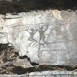 Most of the petroglyphs at Sarmishsay depict people and animals, including hunting scenes. Included amongst the animals are Saiga antelope, wild mountain sheep and goat, elephant, lion, tiger, and cheetah. The pictures of aurochs (wild cattle) are particularly important in helping archaeologists date the petroglyphs, as aurochs became extinct in this area from over-hunting in the 2nd millennium BC.[7] Not all of the images are true to life: there is a camel with three humps, and a man with two heads.[5] The petroglyphs made by Scythian artists during the Iron Age often show domesticated animals, which shows how society had developed by this time. There is an image of a shepherd on horseback, a Bactrian camel, and a dog, which might have been a pet.[2] The Scythians also made artworks of religious rites, including ecstatic dances, religious symbols, and even Zoroastrian priests worshipping at a fire temple.[7]