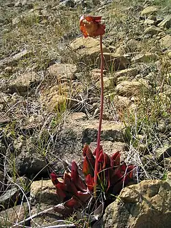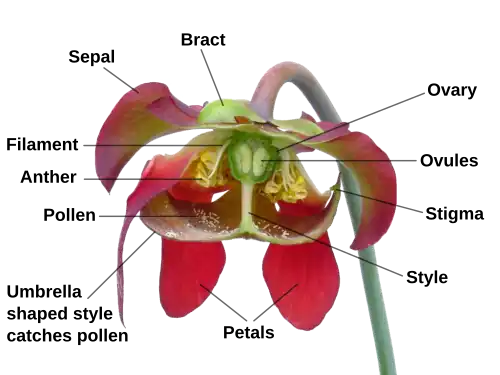 Flowers are produced early in spring, with or slightly ahead of the first pitchers. They are held singly on long stems, generally well above the pitcher traps to avoid the trapping of potential pollinators. The flowers, which depending on species are 3–10 centimeters in diameter, are dramatic and have an elaborate design which prevents self-pollination. It consists of five sepals superintended by three bracts, numerous anthers, and an umbrella-like five-pointed style, over which five long yellow or red petals dangle. The whole flower is held upside-down, so that the umbrella-like style catches the pollen dropped by the anthers. The stigmas are located at the tips of the umbrella-like style. The primary pollinators are bees. Bees searching for nectar must force their way past one of the stigmas to enter the chamber formed by the style. Inside, they will inevitably come in contact with a lot of pollen, both from the hanging anthers and from the pollen collected by the style. Upon exiting, the bees must force their way under one of the flap-like petals. This keeps them away from the stigma, avoiding self-pollination. The next flower visited receives on its stigmata some of the first flower's pollen, and the cycle continues. Only the orchid genus Coryanthes has a more ingenious pollination scheme.[5]