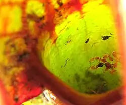 Flowers generally last about two weeks. At the end of the flowering period, the petals drop and the ovary, if pollinated, begins to swell. The seed forms in five lobes, with one lobe producing significantly smaller numbers of seeds than the other lobes.[6] On average, 300–600 seed are produced,[6] depending on species and pollination success. Seed takes five months to mature, at which point the seed pod turns brown and splits open, scattering seed. The seeds are 1.5–2 mm in length and have a rough, waxy coat which makes it hydrophobic, possibly for seed dispersal by flowing water.[7] Sarracenia seed requires a stratification period to germinate in large numbers. Plants grown from seed start producing functioning traps almost immediately, although they differ in morphology from adult traps for the first year or so, being simpler in structure. Plants require 3–5 years to reach maturity from seed.