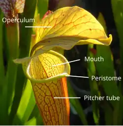 - Zone 1: Operculum. In most species the operculum covers at least part of the pitcher has an opening, preventing rain from excessively filling the pitcher, which would result in the loss of prey and dilute the digestive fluid. The operculum also serves to guide prey to the pitcher opening, using a combination of colors, scents, and downward-pointing hairs to lead insects toward the trap entrance. Some species, specifically S. minor and S. psittacina, have opercula that hang low over the pitcher entrance. These are also studded with chlorophyll-free patches, translucent "windows" which confuse prey into attempting to fly through the operculum, thereby causing them to cascade down the pitcher tube. (A similar, more sophisticated mechanism is also found in the closely related Darlingtonia californica).