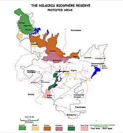 ![]() Map of Nilgiris Biosphere Reserve, showing Sathyamangalam Wildlife Sanctuary | |