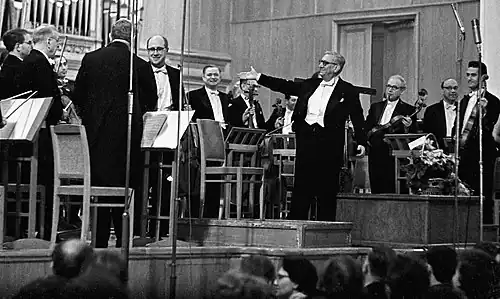 The war period brought a change to Sauguet's work, which had previously been marked by his high spirits. He used his reputation during this time to help his Jewish friends but lost the oldest-established among them, Max Jacob, who died in the Drancy internment camp. At the war's end he completed his Symphony No. 1, known as Expiatoire (Expiatory), in tribute to the war's innocent victims. This was followed by his 2nd Symphony, known as The Allegorical or The Seasons, in 1949. His 3rd Symphony is known as I.N.R. and his 4th, a meditation on old age written as he approached the age of seventy, as Du Troisième Age (The Third Age).[7] In 1945 he contributed incidental music to the premiere of La Folle de Chaillot, by Jean Giraudoux.[8]
