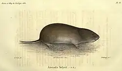 Savi's pine vole (Microtus savii) is a species of rodent in the family Cricetidae, widespread across the Italian peninsula with limited populations in southern France and southern Switzerland. This herbivorous mammal primarily inhabits agroecosystems, including rural areas, orchards, meadows, and agricultural fields, constructing complex burrow systems about 40–50 cm deep. Although its taxonomy remains debated, with proposed subspecies and recent genetic studies suggesting significant divergence between populations, it is recognized as a distinct species from the closely related Microtus brachycercus. Savi's pine vole is known for its ecological impact on agriculture, causing substantial damage to vegetable crops and fruit trees through root consumption and trunk debarking, while serving as a prey species for various predators including owls, kestrels, weasels, and foxes.