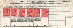 From 1880[1] ordinary penny postage stamps were used to save up one shilling (12 pence) which was then sufficient to open a Post Office Savings Bank account, although the minimum amount required changed to £1 in 1912.[2] This scheme continued until after the Second World War but has now ended. In addition the Bank used specially designed savings stamps with higher values which also could be used to save enough to open an account.