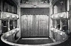 On 3 June 1929 Carte closed the Savoy Theatre, and the interior was completely rebuilt to designs by Frank A. Tugwell with elaborate décor by Basil Ionides. The ceiling was painted to resemble an April sky; the walls, translucent gold on silver; the rows of stalls were all richly upholstered in different colours, and the curtain repeated the tones of the seating. Ionides said that he took the colour scheme from a bed of zinnias in Hyde Park.[3] The entire floor space had been replanned: the old cloakrooms and bar at the back of the theatre were relocated to the side, and instead of 18 boxes there was now only one. The new auditorium had two tiers leaving three levels: stalls, dress, and upper circle. The capacity of the old house, originally 1,292, had been reduced to 986 by 1912,[28] and the new theatre restored the capacity almost completely, with 1,200 seats.[29] The new stage was 29.3 feet wide, by 29.5 feet deep.[7]