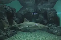 Sawfish are popular in public aquariums, but require very large tanks. In a review of 10 North American and European public aquariums that kept sawfish, their tanks were all very large and ranged from about 1,500,000 to 24,200,000 L (400,000–6,390,000 US gal).[60] Individuals in public aquariums often function as "ambassadors" for sawfish and their conservation plight.[95][96] In captivity they are quite robust, appear to grow faster than their wild counterparts (perhaps due to consistent access to food). Some individuals have lived for decades, but breeding them has proven difficult.[60] In 2012, four smalltooth sawfish pups were born at Atlantis Paradise Island in the Bahamas and, in 2023, another three were born at SeaWorld Orlando in Florida; these remain the only times a member of this family has been successfully bred in captivity.[60][94][97] Unsuccessful breeding attempts had taken place earlier at the same facility, including a miscarriage in 2003.[98] Nevertheless, it is hoped that this success may be the first step in a captive breeding program for the threatened sawfish.[4] It is speculated that seasonal variations in water temperature, salinity and photoperiod are necessary to encourage breeding.[60] Artificial insemination, as already practiced with a few captive sharks, is also being considered.[99] Tracking studies indicate that if sawfish are released to the wild after spending a period in captivity (for example, if they outgrow their exhibit), they rapidly adopt a movement pattern similar to that of fully wild sawfish.[100]