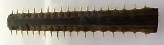 The most distinctive feature of sawfish is their saw-like rostrum with a row of whitish teeth (rostral teeth) on either side of it. The rostrum is an extension of the chondrocranium ("skull"),[28] made of cartilage and covered in skin.[38] The rostrum length is typically about one quarter to one third of the total length of the fish,[5] but it varies depending on species, and sometimes with age and sex.[3] The rostral teeth are not teeth in the traditional sense, but heavily modified dermal denticles.[39] The rostral teeth grow in size throughout the life of the sawfish and a tooth is not replaced if it is lost.[39][40] In Pristis sawfish, the teeth are found along the entire length of the rostrum, but, in adult Anoxypristis, there are no teeth on the basal one-quarter of the rostrum (about one-sixth in juvenile Anoxypristis).[41][42] The number of teeth varies depending on the species and can range from 14 to 37 on each side of the rostrum.[1][43][note 1] It is common for a sawfish to have slightly different tooth counts on each side of its rostrum. (The difference typically does not surpass three.)[44][45] In some species, females on average have fewer teeth than males.[3][44] Each tooth is peg-like in Pristis sawfish, and flattened and broadly triangular in Anoxypristis.[1] A combination of features, including fins and rostrum, are typically used to separate the species,[1][43] but it is possible to do it by the rostrum alone.[46]