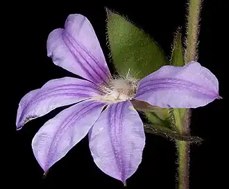 Scaevola platyphylla, commonly known as broad-leaved fanflower, is a shrub in the family Goodeniaceae. It is endemic to the south-west of Western Australia. Plants grow to between 0.3 and 1.3 metres high and have blue to purple flowers that appear between August and January in their native range.[4]