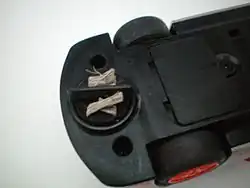 Scalextric is controlled with a hand-held plunger, connected by wire to a connector on the set. A set normally has two to six plungers included. Mounted in the track (for each lane) are two metal rails, which for Analogue carry the DC current from the controllers, or for Digital have constant AC current passed through them, in either case picked up by two metal braids or plates on the underside of the racing cars.[12]